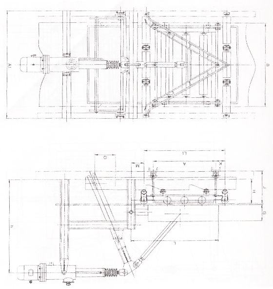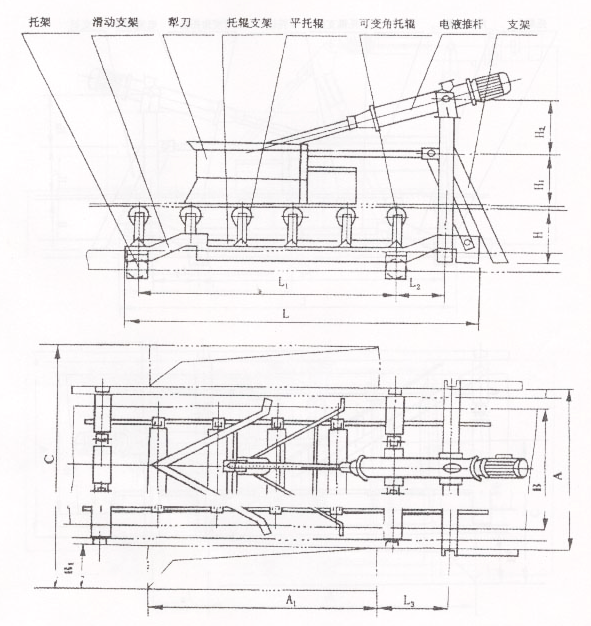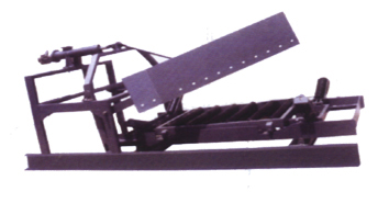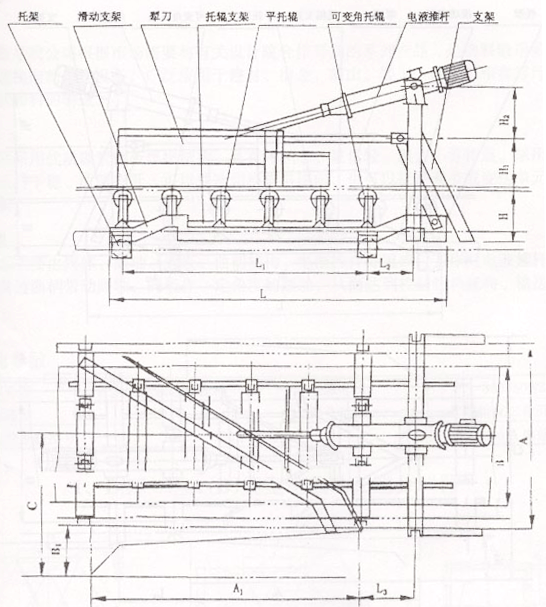 電液動犁式卸料器以電液動推桿為動力源,帶動框架前進,完成犁頭下落,并支承平托輥,犁刀下緣與膠帶貼合,完成卸料。完華后,框架后退,犁頭上抬,變形托輥恢復(fù)槽形,膠帶則則恢復(fù)槽形,物料平穩(wěn)通過。